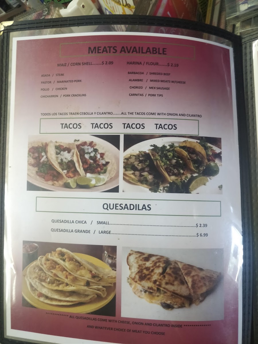 OUR QUESADILLA IS MADE WITH YOUR CHOICE OF MEATS ASADA, PASTOR(MARINATED PORK), CHICKEN, SHREDDED BEEF,PORK TIPS CHIPS ON SIDE COMES WITH ONION AND CILANTRO INSIDE (UNLESS STATED)